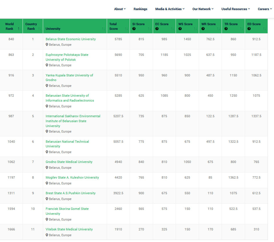В рейтинге 2025 приняли участие 1745 университетов из 105 стран, в том числе 11 белорусских вузов, среди которых Белорусский государственный экономический университет, занявший в национальном рейтинге 1-ю, а в мире – 840-ю позицию.
