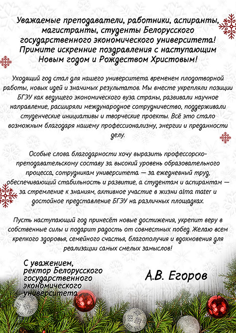 READ IN THE DECEMBER ISSUE OF OUR PUBLICATION: 1. Celebrating the New Year Together: Holiday Greetings for the BSEU Staff 2. From Cyprus to Belarus: A Student's Impressions of Life and Study 3. Curators' Forum: BSEU Experience, Victories, and a Perspective on Curating 4. From Idea to Podium: How a BSEU Associate Professor Became a Speaker at the Eurasian Forum 5. "Narxoz" in the Heart: How the Alumni Community Strengthens Ties and Traditions 6. The New Chairman of the Council of Young Scientists: On Plans and Prospects 7. The Philosophy Department's Anniversary: History, Achievements, and the Future