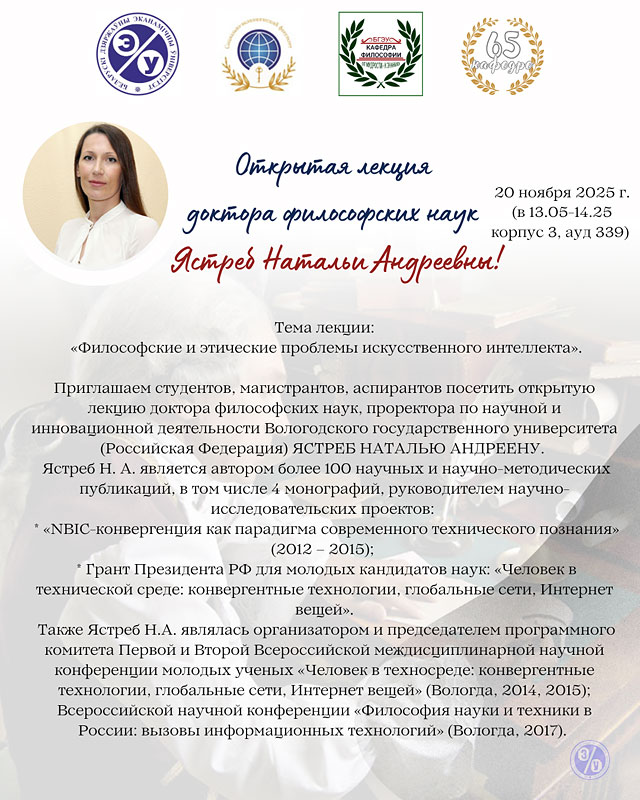 Запрашаем Вас наведаць адкрытую лекцыю доктара філасофскіх навук Н.А. Ястраб (г. Волагда, Расійская Федэрацыя) і паўдзельнічаць у конкурсе для студэнтаў і супрацоўнікаў БДЭУ "Пераўвасобіцца ў філосафа!"
