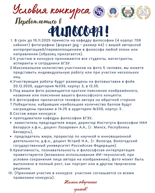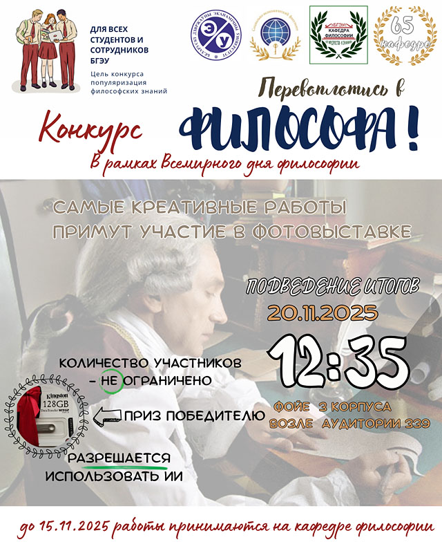 20 лістапада Беларускі дзяржаўны эканамічны ўніверсітэт стане пляцоўкай для яркай інтэлектуальнай падзеі, прымеркаванай да Сусветнага дня філасофіі. У гэты дзень студэнты і супрацоўнікі ўніверсітэта змогуць дакрануцца да глыбінь філасофскай думкі і праявіць творчы патэнцыял.